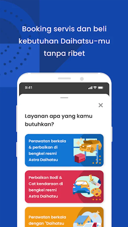 - Booking Service: memberikan kemudahan merawat mobil Daihatsu di bengkel Astra Daihatsu dengan keleluasaan memilih jadwal dan lokasi yang sudah pasti tersedia dengan jenis pekerjaan perawatan/perbaikan sesuai kebutuhan.