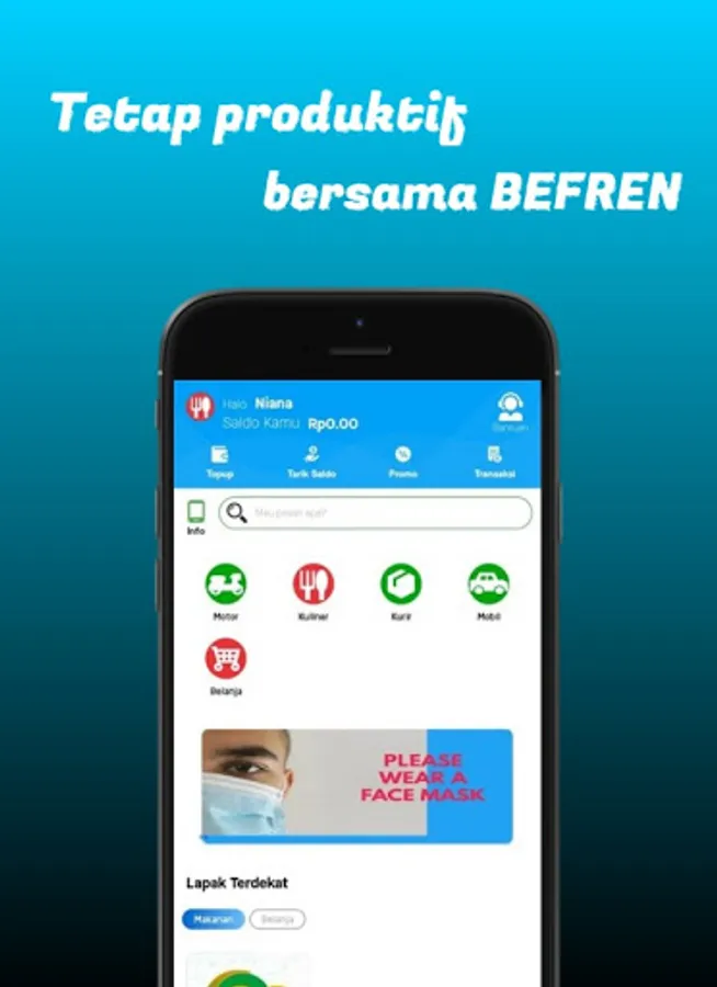 BEFREN will help you to stay productive at home armed with the various services we provide. You can do groceries, food delivery, logistics and even contract drivers to shop at the market.