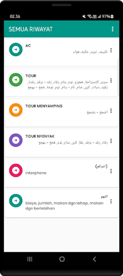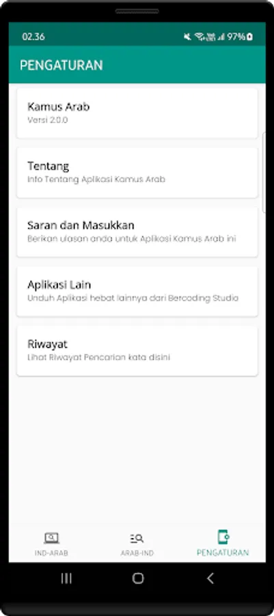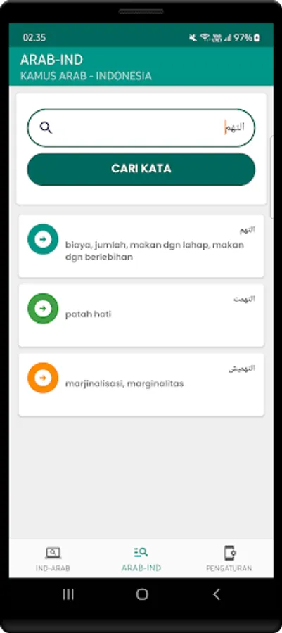 The Arabic Word Dictionary application is very easy to use supported by an attractive appearance, I hope this Indonesian Arabic Dictionary application is useful as a means of learning Arabic for you.