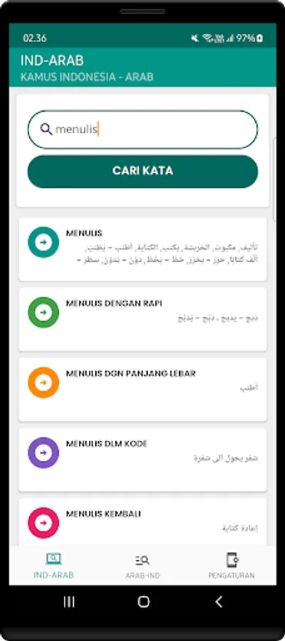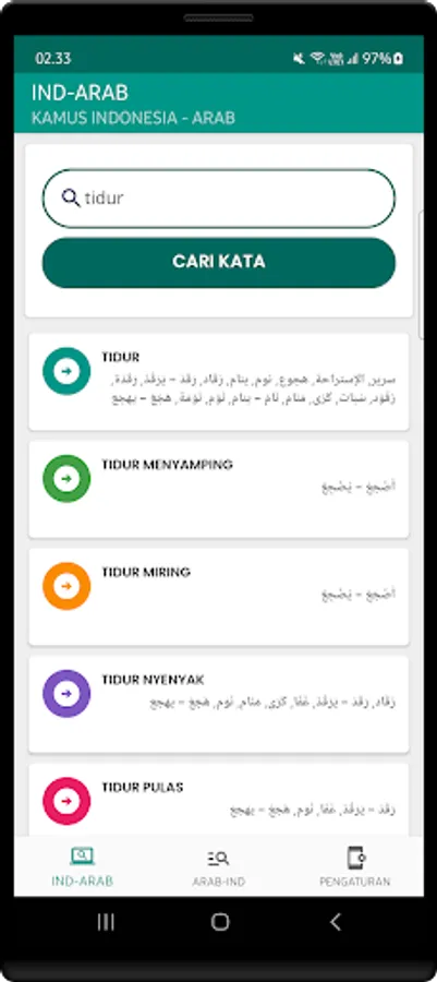 The Arabic - Indonesian Dictionary is an application that contains an Arabic - Indonesian word dictionary or an Indonesian - Arabic word dictionary which is complete and very easy to use with an effective Arabic word dictionary search feature.