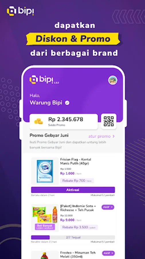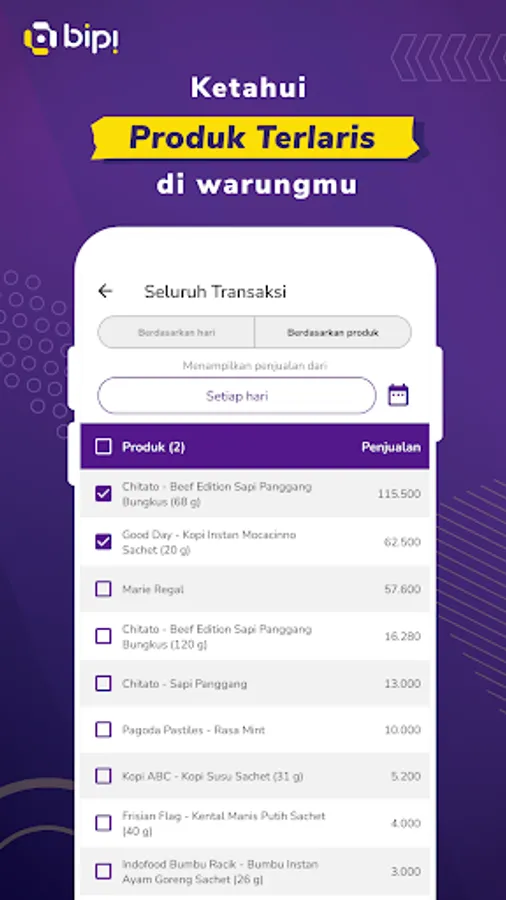 Bipi bantu kamu untuk catat setiap penjualan di warung, toko kelontong, dan kios dengan lebih mudah. Cukup scan dengan kamera HP, semua tercatat otomatis. Dapatkan juga berbagai penawaran & promo menarik untuk warungmu!