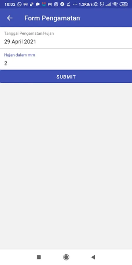 This feature is used by observers of the rain post to input rainfall data from the cooperation rain post. The inputted parameters are the date of observation along with the amount of rainfall in millimeters.