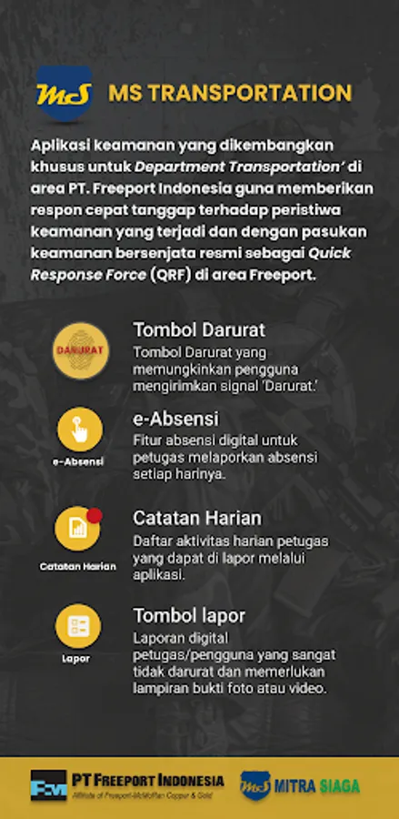 MS One App (TRANSPORTATION) is a special Security Application and management officer for 'Transportation' PT. Freeport which was formed by PT. Standby Partner