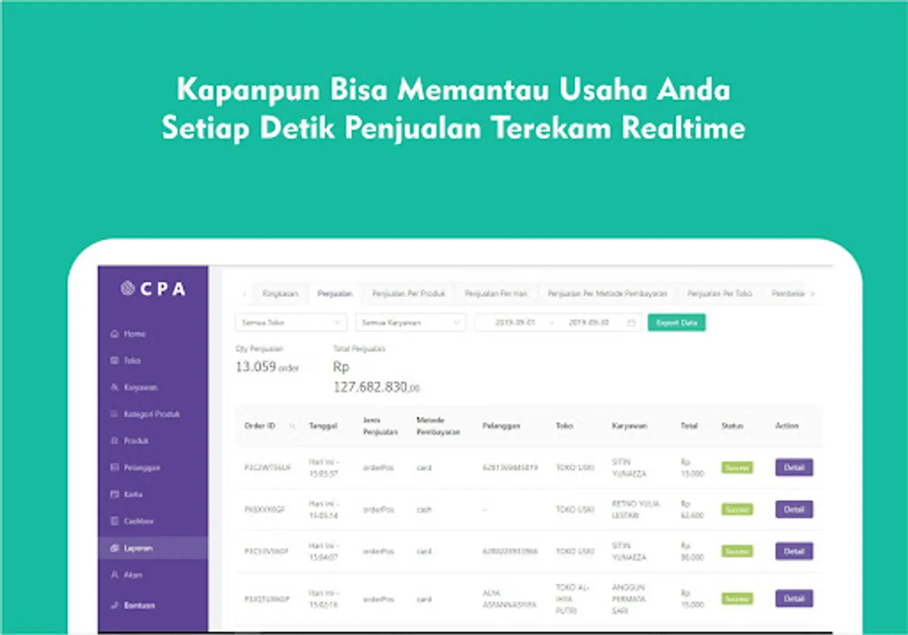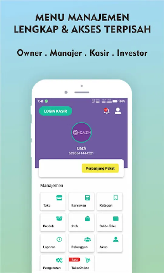 Cazh provides low price services so it is suitable for MSME cashier applications in the fields of: Grocery Store, Laundry, Barbershop, Salon, Beauty Clinic, Franchise, Cafe, Restaurant, Street Vendor, Car Wash, Canteen, Electrical Shop, Mobile Phone Shop, Boutique, Clothing shops and Warteg, food stalls, etc.
