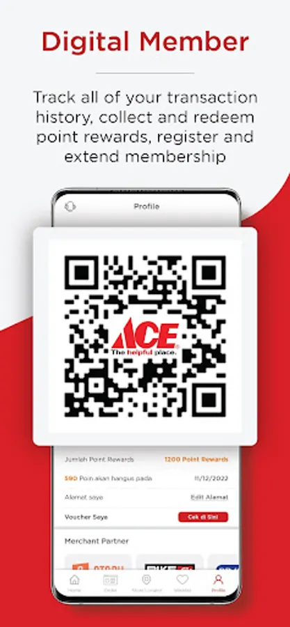 New experience for ACE Rewards members. Log in to your account in our brand new app and find all the information here. You can check your transaction history (both from stores and ACE Online), point rewards accumulation and expiration date, extend your membership and many more.
