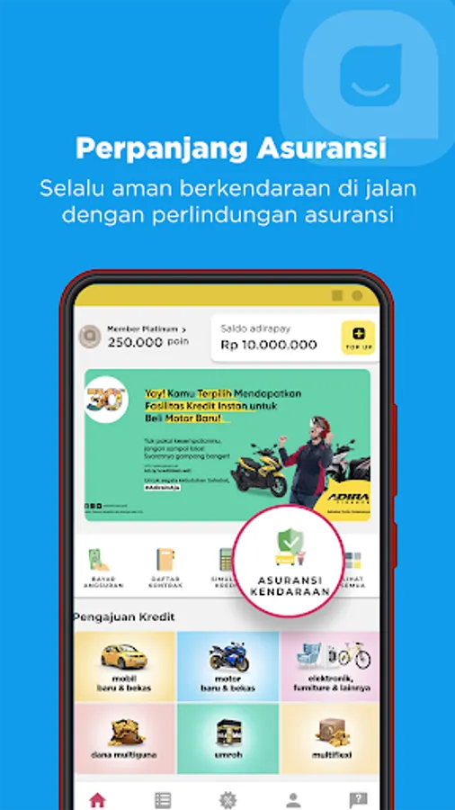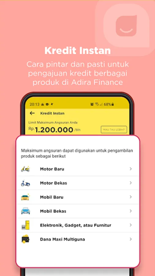 Loans for new cars, used cars, new motorbikes or used motorbikes, electronic goods (TV, AC, refrigerator, washing machine), furniture (spring beds, sofas, cabinets, tables), cellphones to bicycles are easier through the Adiraku application. Apply for credit directly with conventional or Sharia schemes with the best promotions. You can get your dream vehicles and goods easily, quickly, with the best prices and installments.