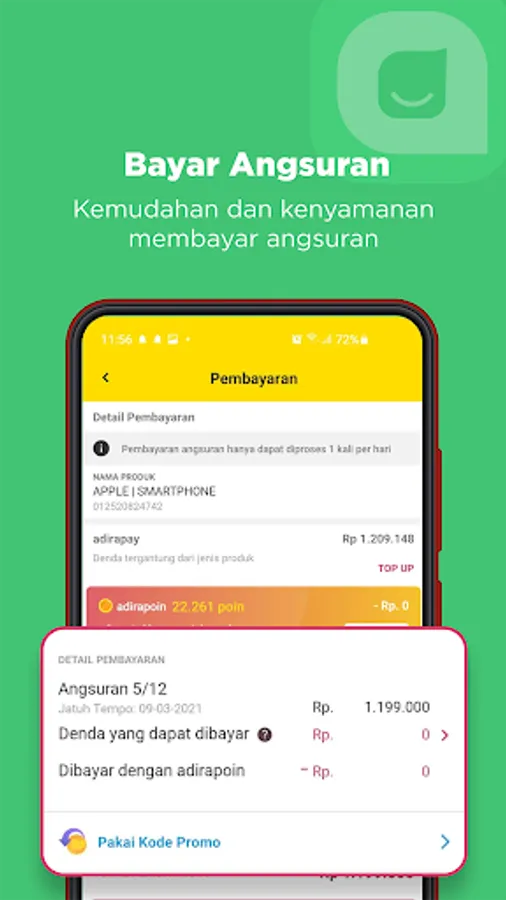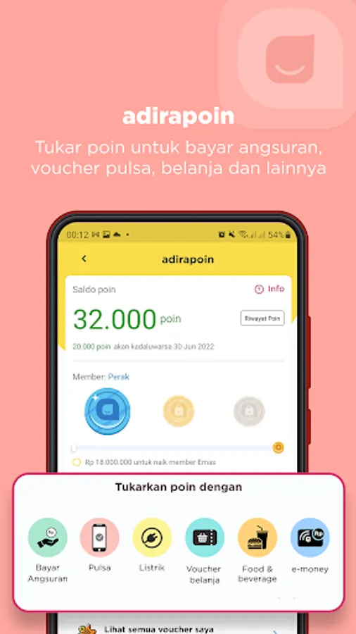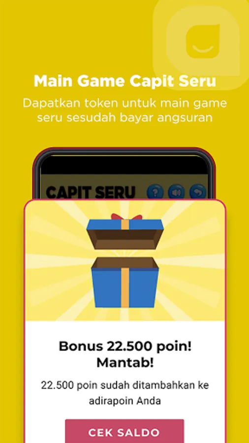 Pay installments on time in all payment channels, there are points that can be used to pay installments or exchanged for various Adira Finance partner vouchers, such as phone credit, electricity, shopping, food, and electronic money. Play fun games and do various activities in the app to get additional bonus adirapoin.