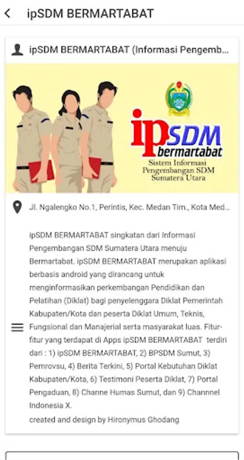 ipSDM BERMARTABAT stands for North Sumatra HR Development Information towards Dignity. ipSDM BERMARTABAT is an android-based application that is designed to inform the development of Education and Training (Diklat) for organizers of District / City Government Training and participants in General, Technical, Functional and Managerial Training as well as the wider community. The features contained in the MARTABAT IPSDM Apps consist of: 1) MARTABETIC IPSDM, 2) North Sumatra BPSDM, 3) Provincial Government, 4) Latest News, 5) Regency / City Training Needs Portal, 6) Training Participants Testimony, 7) Complaints Portal , 8) North Sumatra Public Relations Channe, and 9) Channnel Indonesia X.