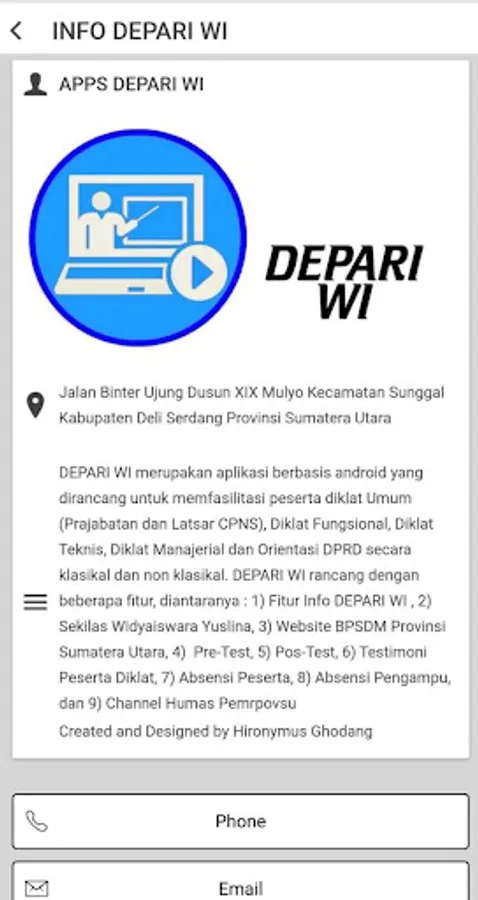 DEPARI WI is an android-based application that is designed to facilitate participants of General Education (Pre-service and Latsar CPNS), Functional Training, Technical Training, Managerial Training and Orientation of DPRD in a classical and non-classical way. DEPARI WI designed with several features, including: 1) Info features DEPARI WI, 2) Overview of Widyaiswara Yuslina, 3) BPSDM North Sumatra Province Website, 4) Pre-Test, 5) Post-Test, 6) Testimonials of Training Participants, 7) Participant Attendance, 8) Attendance Attendance, and 9) Public Relations Channel Pemovpovsu