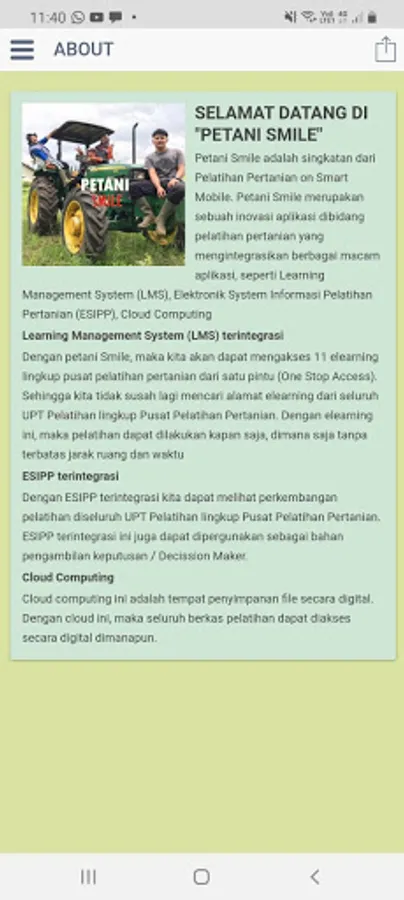 Farmers Smile is an application issued by the Agricultural Training Center, BPPSDMP, Ministry of Agriculture which functions to integrate application data in the scope of Puslatan in the form of a mobile application.