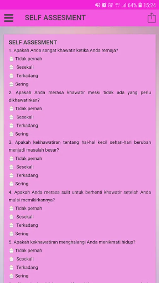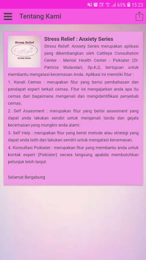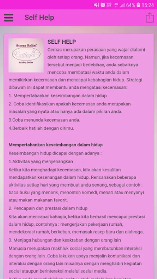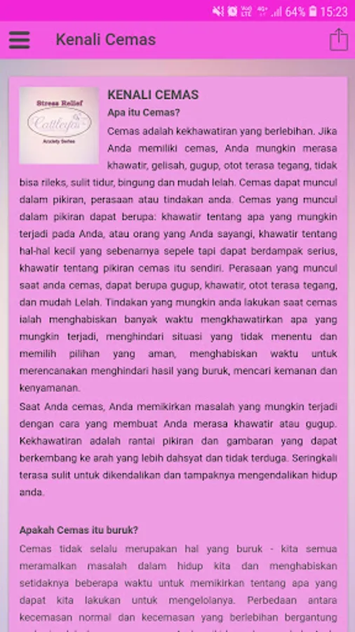 Stress Relief: Cemas Series, is an application developed by Cattleya Consultation Center - Mental Health Center, which aims to assist in stress management. This application contains educational features about stress, how to assess anxiety disorders to self-help methods that help you deal with stress. This application also provides the opportunity for direct contact with experts - Psychiatrists.
