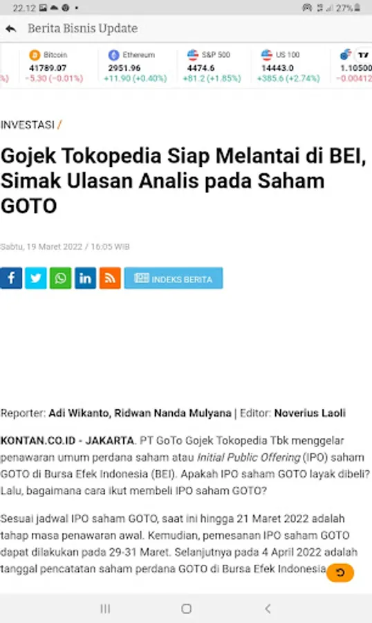 Burita Business & Economics is part of burita that specializes in providing economic and business information and is equipped with tools for monitoring stock movements, forex and crypto currencies. making it easier for you to continue to update information in the field of Business and Finance. In addition, this application also features a business calculator, including calculating currency conversions and calculating bank loan installments. So, what are you waiting for, please download and enjoy the information.