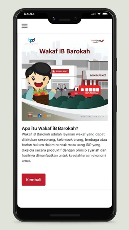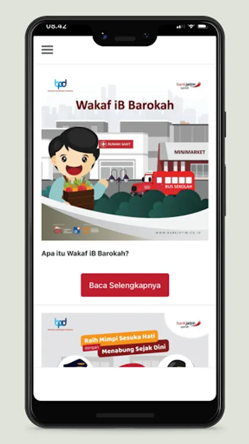 Hanya dengan membuka aplikasi wakaf iB Barokah, Anda dapat melakukan transaksi wakaf kapanpun dan dimanapun. Bekerjasama dengan Nazhir terpercaya dan terdaftar di Badan Wakaf Indonesia, Anda dapat dengan mudah memilih berbagai project wakaf pilhan sesuai keinginan Anda. Kini berwakaf semakin mudah dengan Wakaf iB Barokah Bank Jatim.