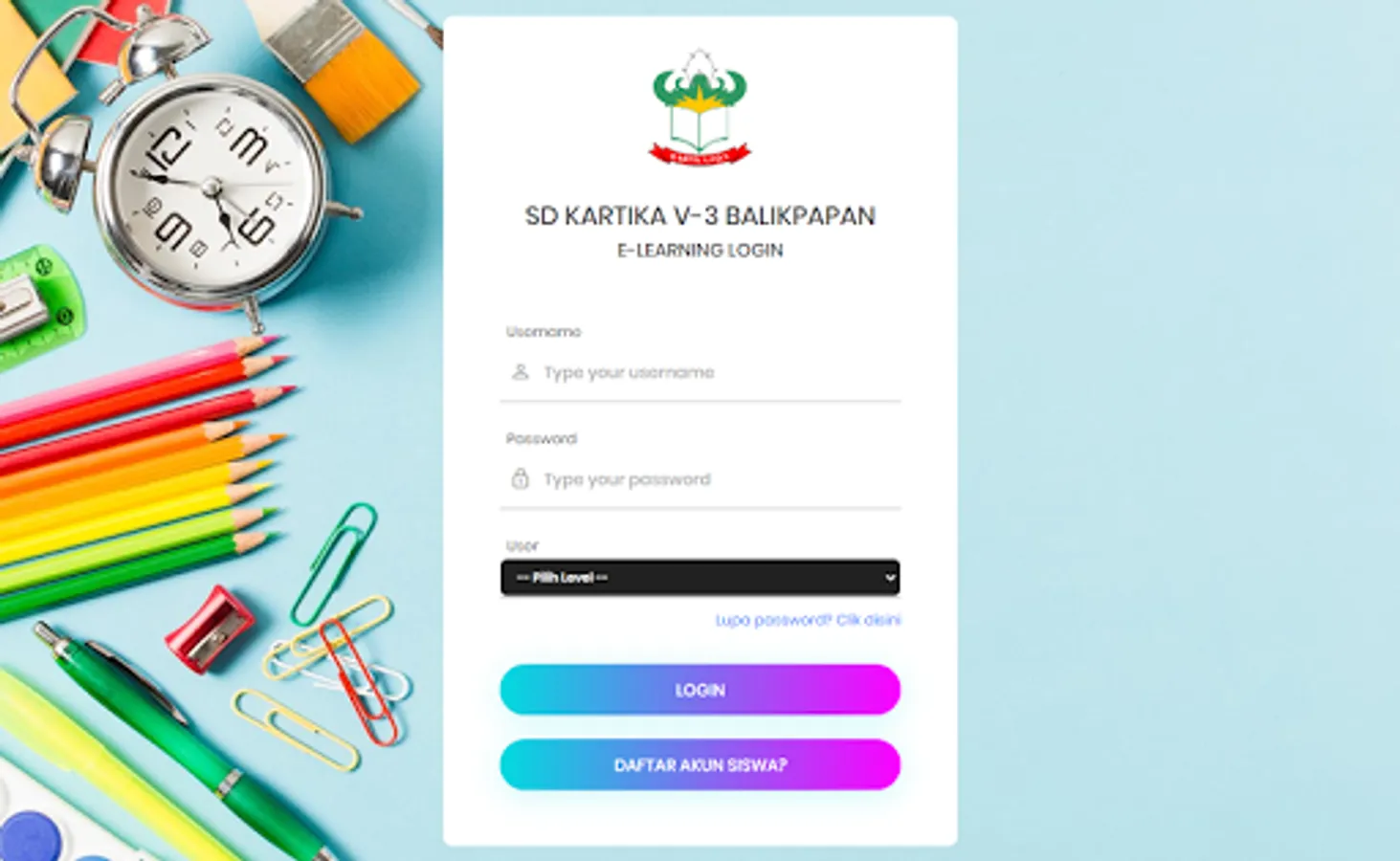 This e-learning application is specifically designed so that teachers and students of SD Kartika V-3 Balikpapan can still carry out learning activities and examinations online