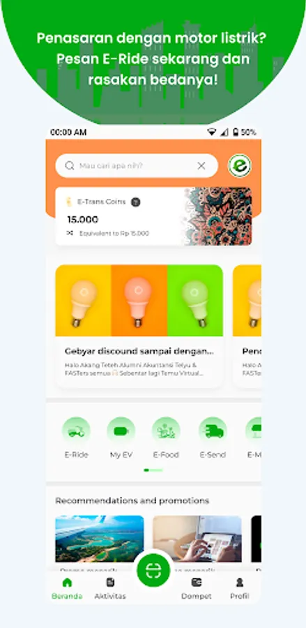 The e-Trans application is an environmentally friendly option because it provides transportation services with electric vehicles (EV), which have lower emissions and lower operational costs compared to petrol or diesel vehicles. This shows that e-Trans provides transportation solutions that meet the needs of today's society, which are easier to use and environmentally friendly.