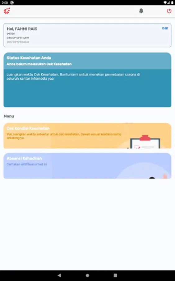 Application intended for employees of PT Infomedia Nusantara throughout Indonesia in conducting online presence when entering and leaving work. This application is integrated with the HR application which will provide attendance reports for monitoring leaders / superiors.
