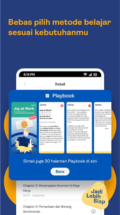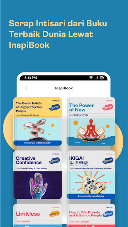 Over a thousand of curated micro-learning content for immediate knowledge: bite-sized learning podcasts, mindfulness and audio guided meditation content, world best-selling book summaries (Inspibook), world best business case studies (Inspigo Case Study), and career how-tos guide (InspiGuide), that are wrapped in 15-20 minutes duration.
