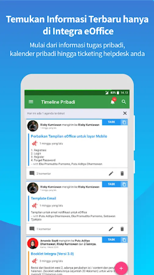 This is the WA team of the Sales team, this is the Production team WA group, this is the Hangout Team Project, if this is the Telegram Finance team? Oops are very busy, not to mention being asked to look for yesterday's proposal that was sent to the WA group 3 days ago. Do you experience this everyday in the office? if it's true, maybe it's time for you to prove whether IntegraOffice Community Portal can solve your problem. The public timeline feature, group timeline / project can make you calm and can focus on completing tasks one by one without always being disturbed by notifications. The post feature, friend comments and tags make the company's internal communication as easy as social media without the negative impact due to the incorporation of personal and work affairs. Knowledge sharing is increasingly practical with the existence of a Knowledge Management System Module that aims to increase the level of learning in your organization.