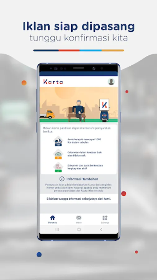 Karta is a technology company that became a liaison between motorists and those who want to advertise. By being co-Karta, riders will earn extra income without having to leave their daily work routine. They just simply help advertise during drive by installing a billboard on a motorcycle driven.