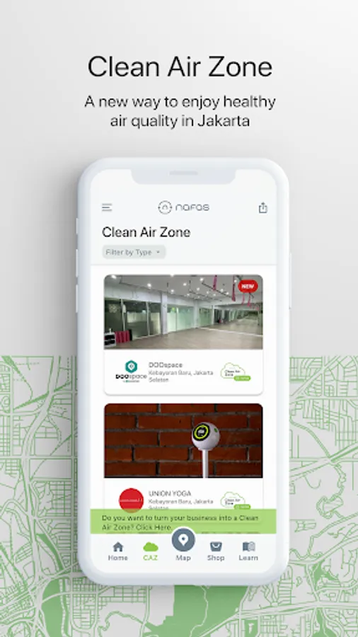 A new way to stay healthy. For the first time, you can access a curated directory of public locations in Jakarta that have been certified to have healthy indoor air by nafas. Consisting of public gyms, yoga studios, and beauty stores across Jakarta, we have more than 10 locations and new locations will be added every month.