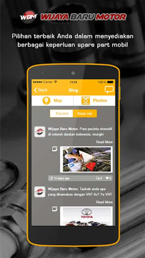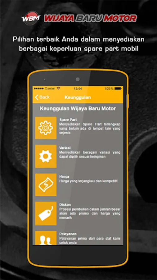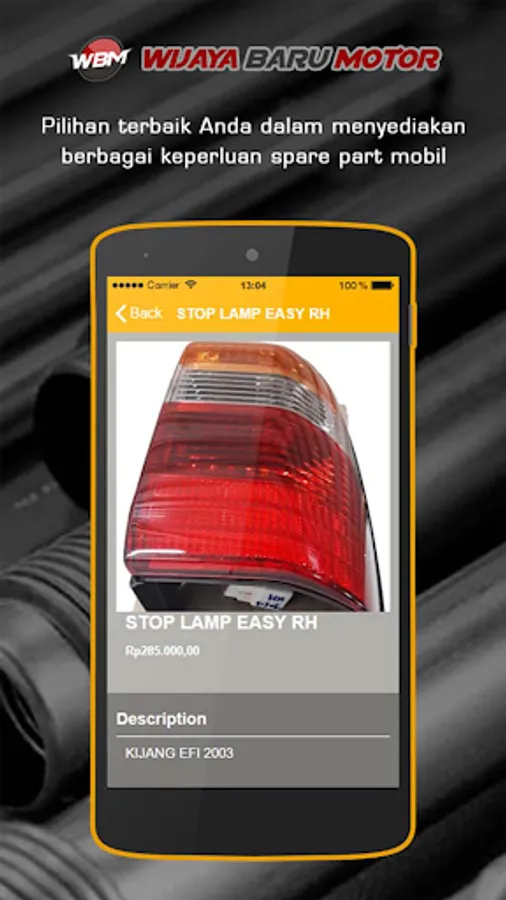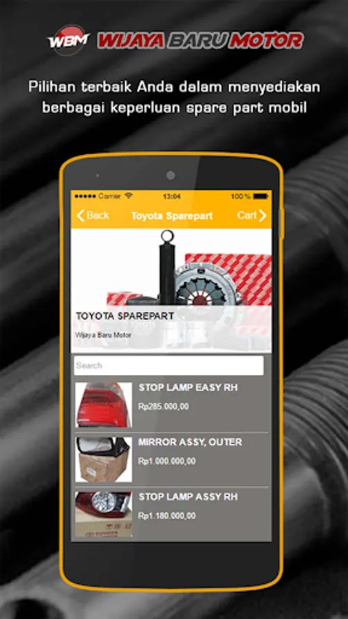 Wijaya Baru Motor adalah perusahaan ritel yang menydiakan spare part aneka mobil, yang berlokasi di alamat Jalan Proyek Senen blok V Lt IV los D.16 No.1 Jakarta Pusat, DKI Jakarta Indonesia. Di awal berdirinya Wijaya Baru Motor hanyalah sebuah toko kecil yang hanya menyediakan beberapa suku cadang tertentu dan terbatas pada sejumlah kecil pengadaan spare part mobil, seperti body, busi, knalpot dan lain sebagainya.