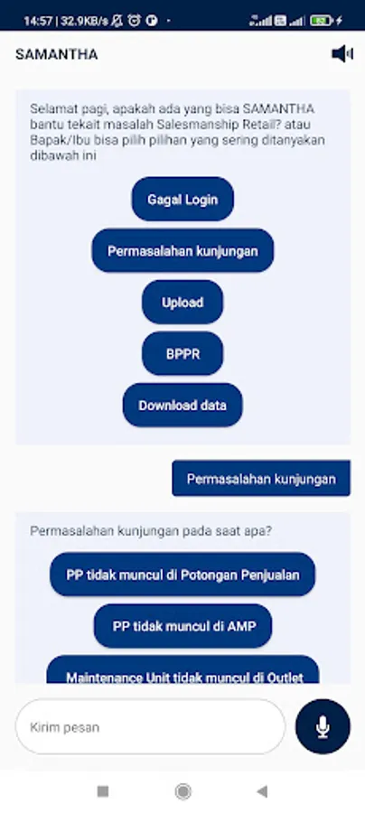SAMANTHA is ready to serve operational complaints and provide direction for problems faced both in the field and at the head office and also provides information regarding the remaining leave and remaining outpatient benefits whenever and wherever you are.