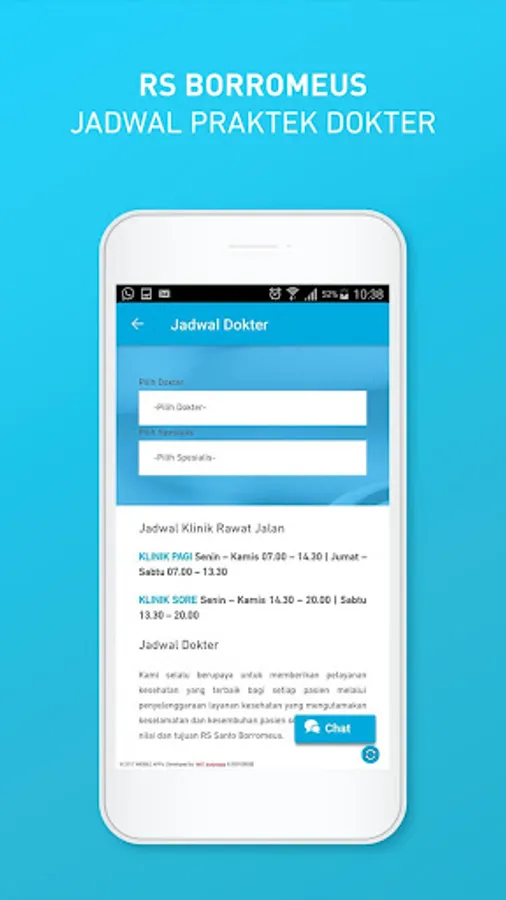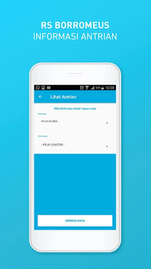 RS Borromeo Mobile Apps is an application module consists of the registration of outpatients, the info queue ongoing, historical patient registration, schedule a doctor, an emergency call to the emergency room, a map of your location to the hospital of St. Borromeo, and other information related to home sick.