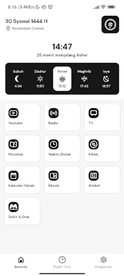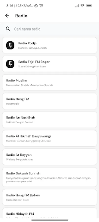 Streaming Radio Rodja, Fajri FM, Hang FM, and other Islamic radio.