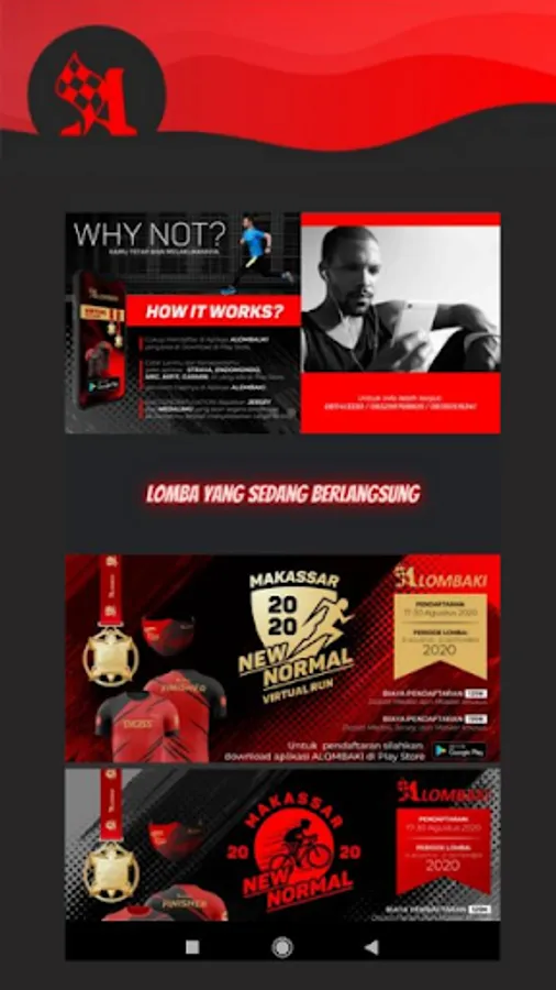 Kamu cukup memilih lomba, mendaftarkan diri dan kamu bisa berlari atau bersepeda dimana saja, kapan saja dan dengan siapa saja. Kamu hanya perlu merekam hasil lari kamu dengan aplikasi perekam olah raga favorite kamu (Endomondo, Strave, Garmin atau apa saja) dan kemudian kirimkan kepada kami melalui aplikasi ALOMBAKI ini.