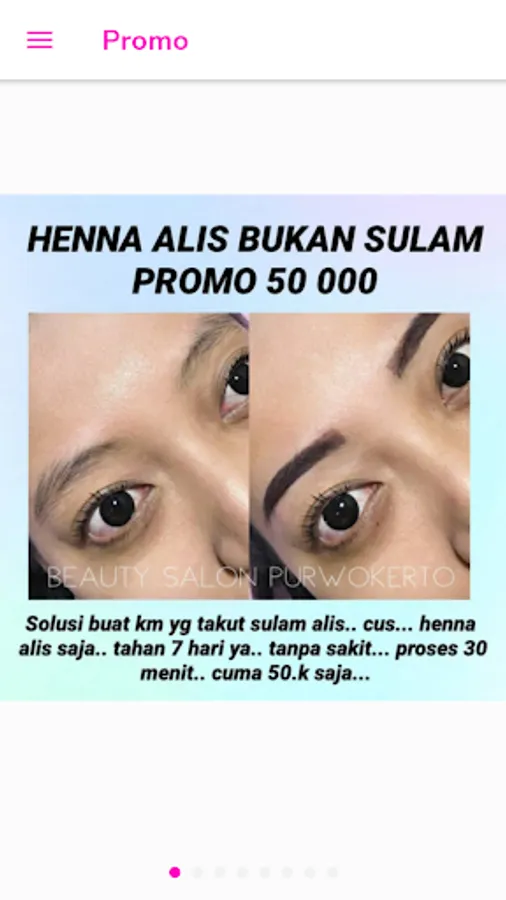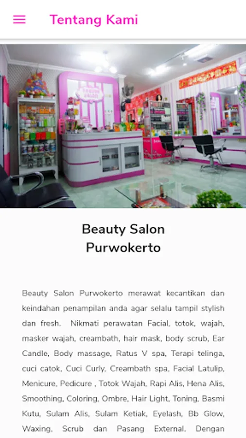 Beauty Salon Purwokerto merawat kecantikan dan keindahan penampilan anda agar selalu tampil stylish dan fresh. Nikmati perawatan Facial, Totok, Wajah, Masker Wajah, Creambath, Hair Mask, Body Scrub, Ear Candle, Body Massage, Ratus V Spa, Terapi Telinga, Cuci Catok, Cuci Curly, Creambath Spa, Facial Latulip, Menicure, Pedicure, Totok Wajah, Rapi Alis, Hena Alis, Smoothing, Coloring, Ombre, Hair Light, Toning, Basmi Kutu, Sulam Alis, Sulam Ketiak, Eyelash, Bb Glow, Waxing, Scrub dan Pasang External.