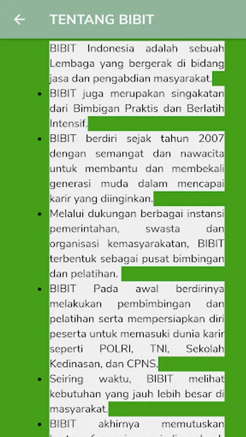 BIBIT Indonesia adalah Lembaga Binlat Penunjang Tes Seleksi bagi para Peminat POLRI, TNI, SEKOLAH KEDINASAN, dan CPNS.