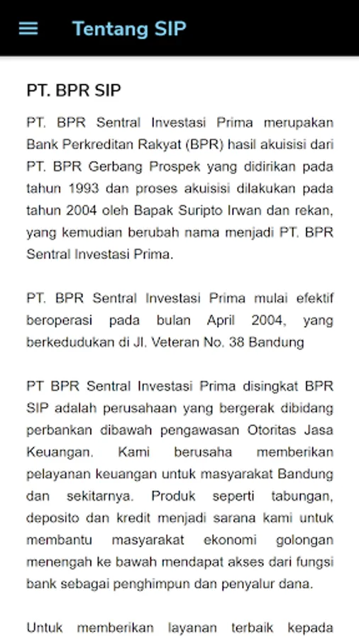 Aplikasi ini dibuat untuk nasabah dan masyarakat umum khususnya di wilayah Kota Bandung dan sekitarnya. Applikasi ini bertujuan untuk memudahkan dalam mengakses informasi layanan perbankan yang tersedia di kami  khususnya penjelasan mengenai produk kredit, tabungan dan deposito serta informasi lainnya yang berkaitan dengan perbankan.