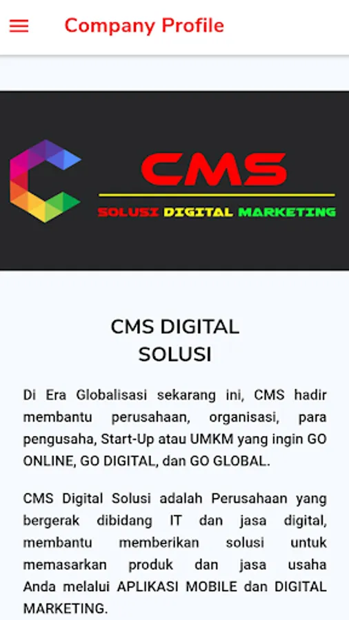 CMS adalah perusahaan yang bergerak dibidang Jasa Solusi Digital Marketing untuk semua pelaku usaha yang ingin Go Online, Go Digital dan Go Global.