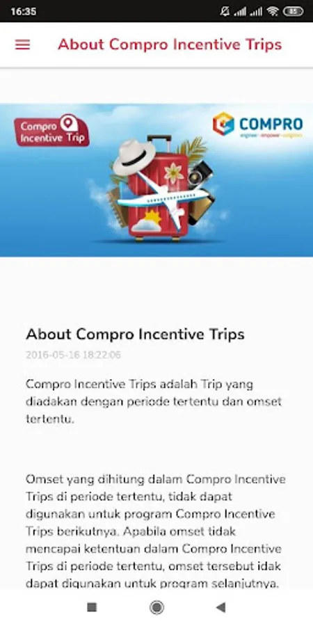 Compro Incentive Trip adalah Aplikasi yang berisikan tentang Trip-Trip yang diadakan oleh Compro sebagai Reward kepada para Affiliates yang sudah mencapai sejumlah SV (Sales Volume) tertentu dan telah memenuhi syarat dan ketentuan yang ditetapkan.