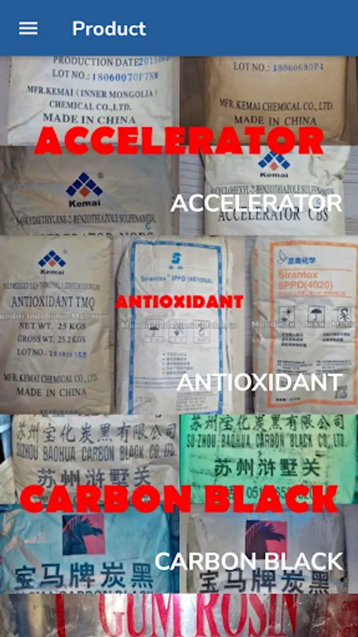 Produk-produk yang ditawarkan meliputi bahan kimia untuk industri karet, baik itu industri ban, automotive, sepatu maupun industri karet yang lain.
