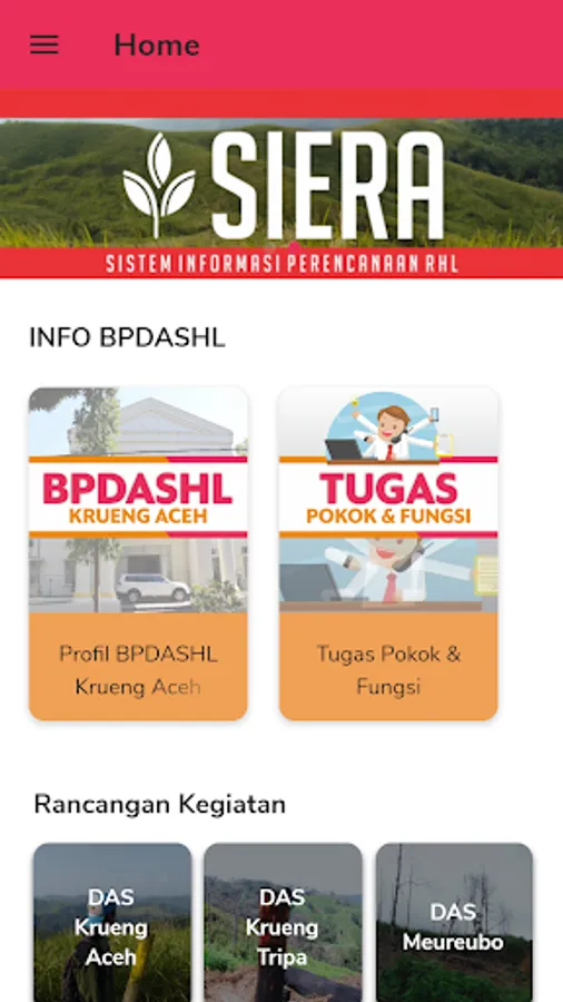 SIERA adalah sebuah aplikasi yang menyediakan layanan data dan informasi perencanaan kegiatan Rehabilitasi Hutan dan Lahan (RHL) lingkup BPDASHL Krueng Aceh. Aplikasi berbasis play store ini dibuat dengan harapan dapat memberikan informasi seluas-luasnya kepada semua pihak terkait yang lebih transparan, akuntabel serta dapat diakses kapan saja oleh siapapun.