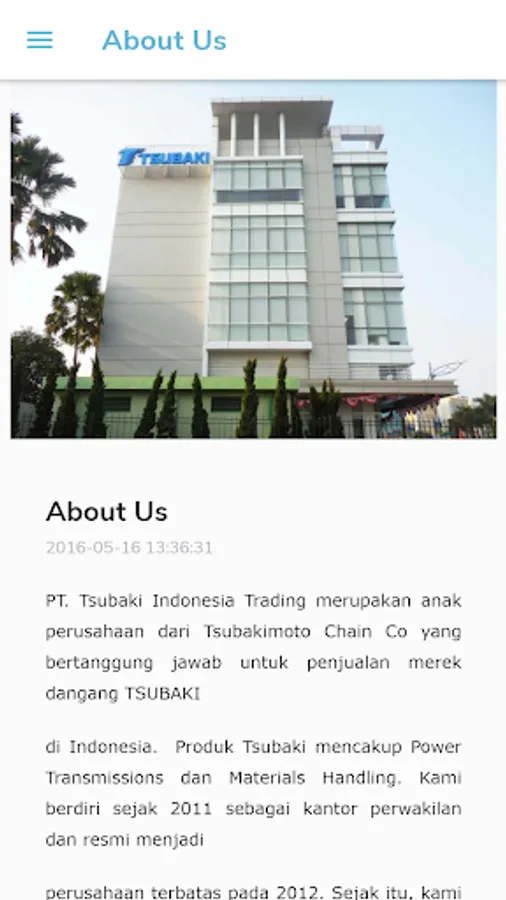 PT. Tsubaki Indonesia adalah cabang perusahaan dari Tsubakimoto Singapore Pte Ltd yang dimana juga merupakan cabang perusahaan dari Tsubakimoto Chain. Kami adalah pengembang dan penyedia untuk power transmission, drive chain untuk industry, assesoris rantai, rantai conveyor baik kecil maupun besar; produk lain terkait dengan cam clutch, sproket, kopling, cableveyor, belt & pulley. Perusahaan kami juga menyediakan materials handling system.