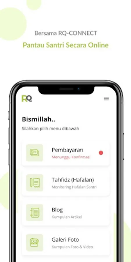 RQ Connect is an application for parents of students at the Riyadhul Qur'an Islamic Boarding School which is used to monitor the development of Ananda, both tahfizh, finance and activities organized by the Riyadhul Quran Islamic Boarding School.