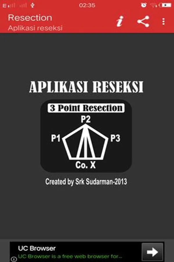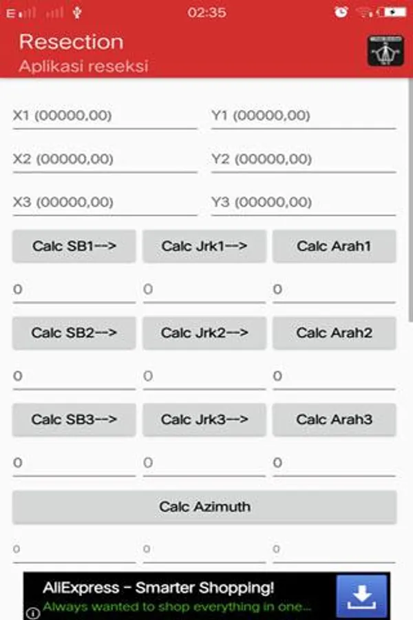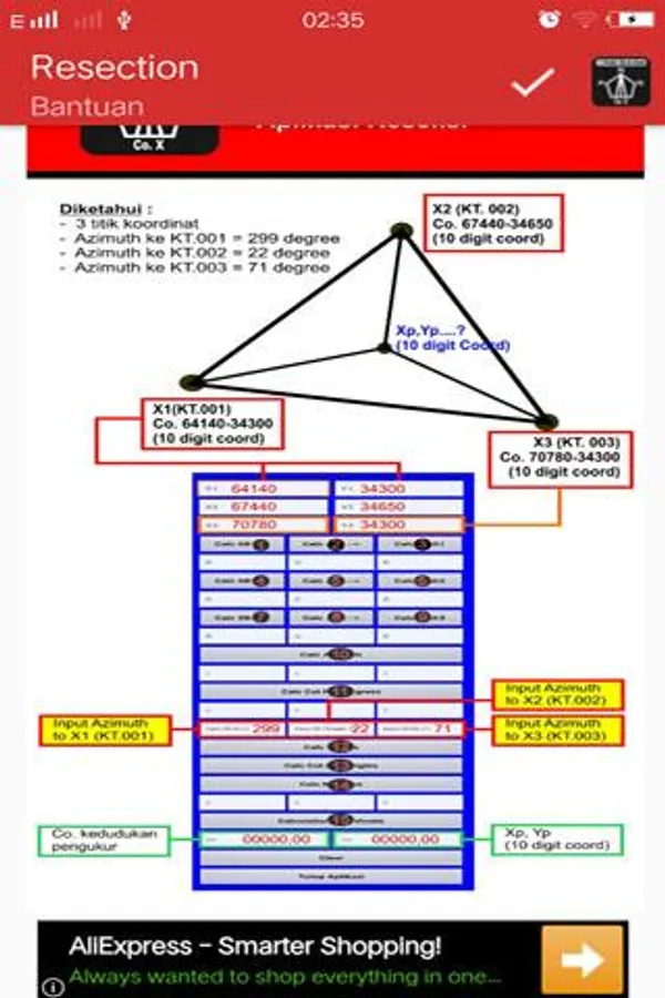 The resection application is an application that can be used to calculate and search for unknown coordinates of its own position with the help of three known coordinate points and the direction angle in degrees to the auxiliary points is also known.
