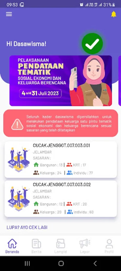 The Dasa Wisma PKK family data collection application for DKI Jakarta Province is part of the Empowerment and Family Welfare Management Information System (SIM PKK). Information on the results of the Dasa Wisma Data Collection will become a reference source in policy development, program planning and decision making for the DKI Jakarta provincial government, academics, stakeholders and the community. PKK as a government strategic partner is expected to be able to provide information from the community quickly and accurately to create a Happy and Prosperous Family in DKI Jakarta Province.
