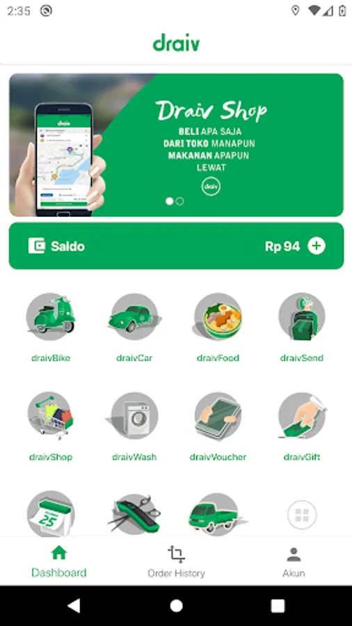 Aside from being a transportation facility, Draiv also provides other services such as ordering food, sending goods, shopping for goods, laundry services, purchasing credit & game vouchers and online alms.