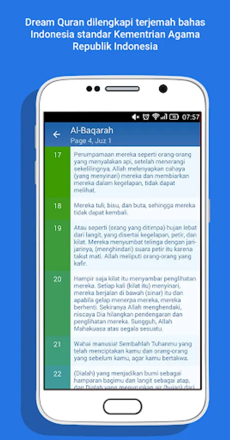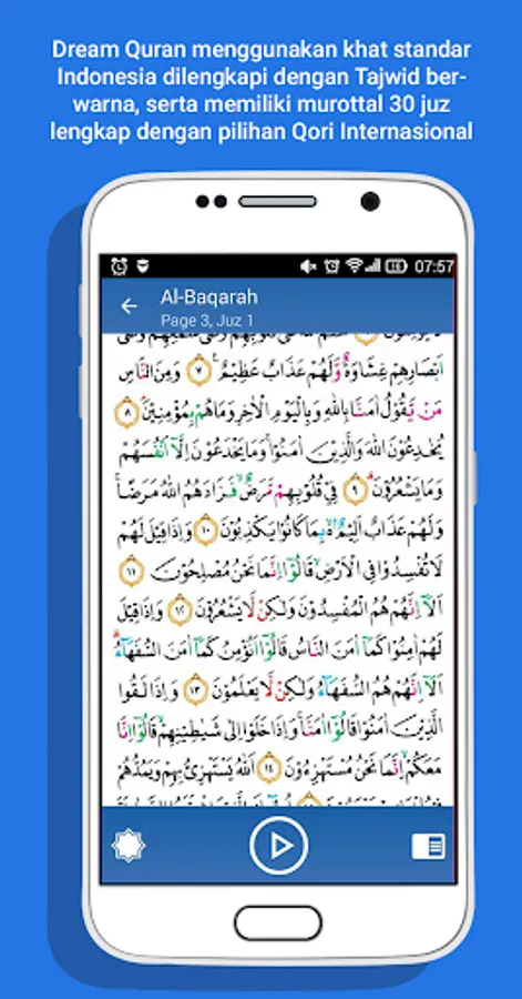 Dream Quran is per-page Quran application with Indonesian standart. Dream Quran equipped with full color tajwid guidance, daily target Quran recitation with graph, and many other. In this application also comes with the following features :