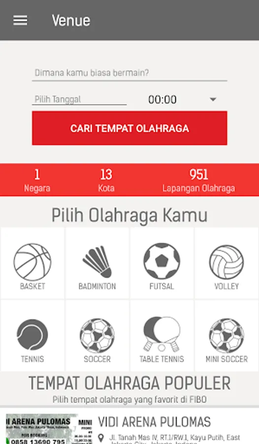 Information system that this application provided is so detail so that user can search for a specific sport venue devided by category such as sport type, closes to your location (city or venue name), facility that is available, indoor or outdoor, and even flooring material (synthetic/ carpet/etc).