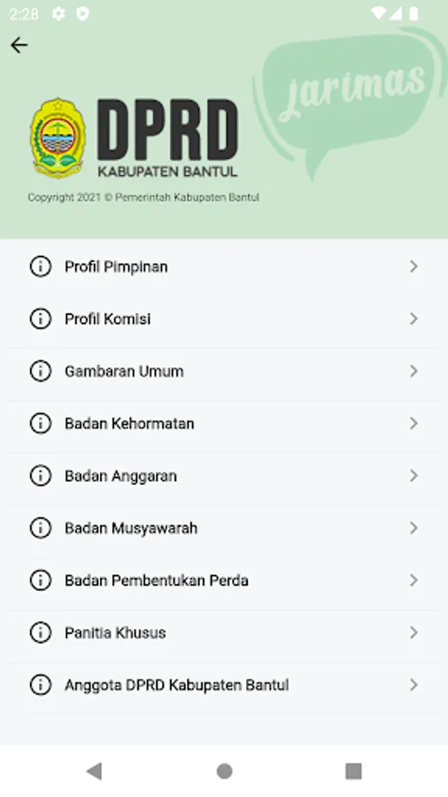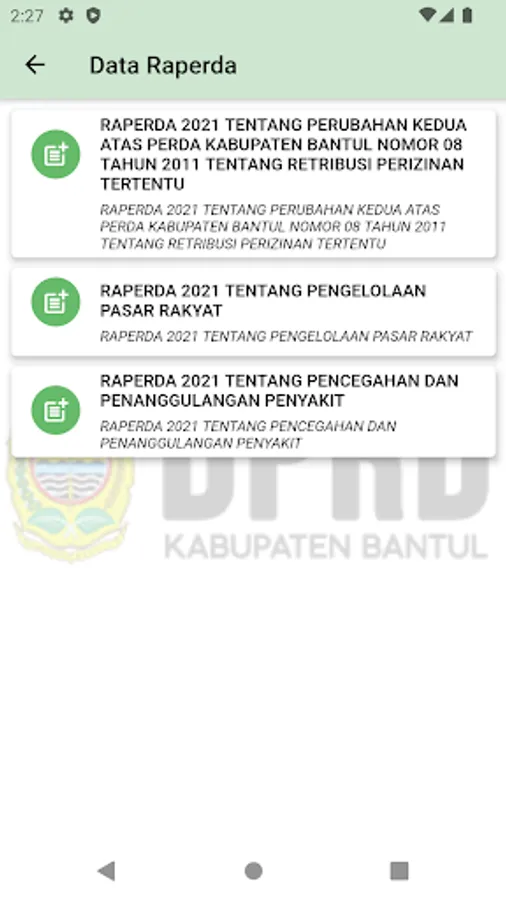 It is a service that aims to accommodate various aspirations of the community to the Bantul Regency DPRD, both services for the publication of the Raperda, a service for accommodating proposals for the Raperda and services for the publication of information on DPRD activities.