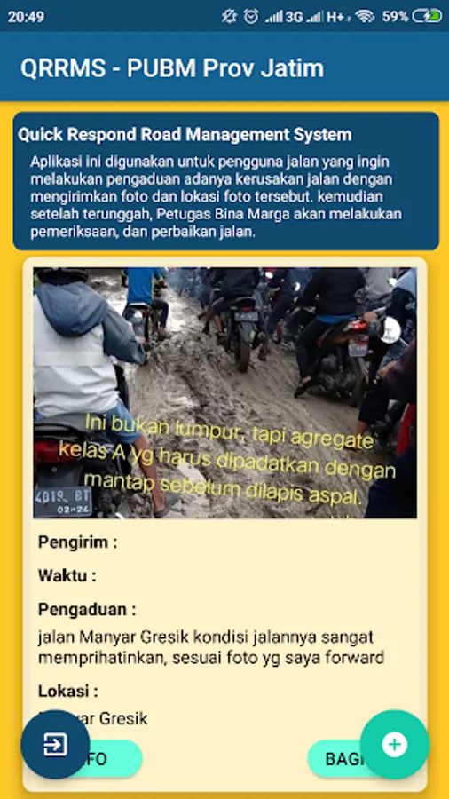 This application is used for the public to provide complaints regarding damaged or problematic roads to the Public Works Department of East Java Province in order to provide a response by relevant parties.