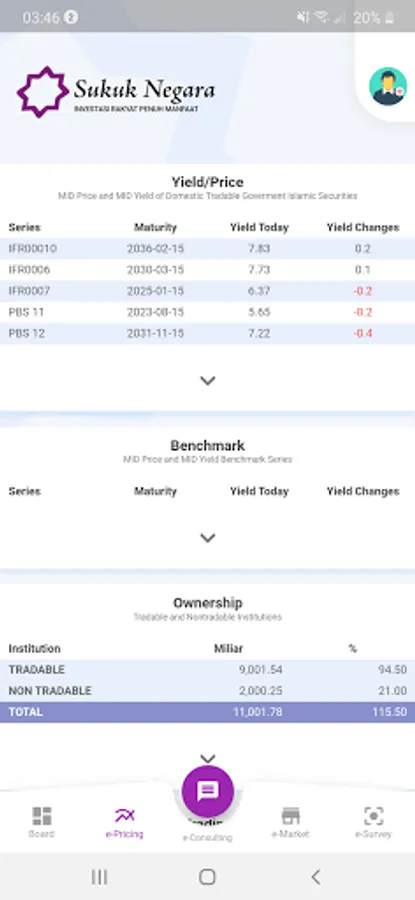 a. e-pricing, consisting of data: yield / price, benchmark series, ownership, trading.