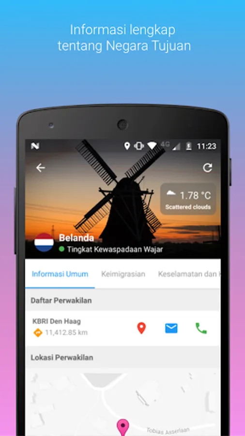 You can access information of your destination country which include: differences in time, conditions of security, law and local customs, immigration requirements, health services at the Embassy / Consulate / KRI, culinary Indonesia to places of worship.