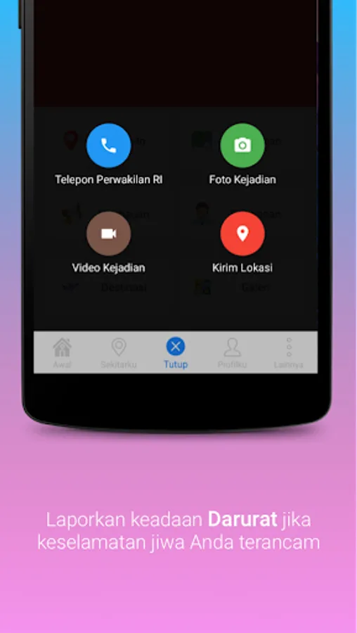 EMERGENCY Safe Travel features that can be used to ask for help quickly in conditions mebahayakan your soul. You can send your location, record video and call the Embassy / Consulate / KRI nearby and reported the incident you experienced.