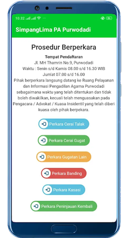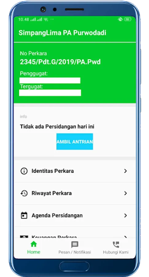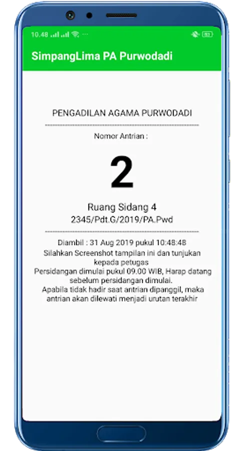 The parties seeking justice can also view case information and retrieve court queue numbers in accordance with the trial schedule that has been determined through the Purwodadi SimpangLima PA application by scanning the QR Code on the Case Service Card that has been given when registering the case or by going through a mobile number or NIK which has been registered.