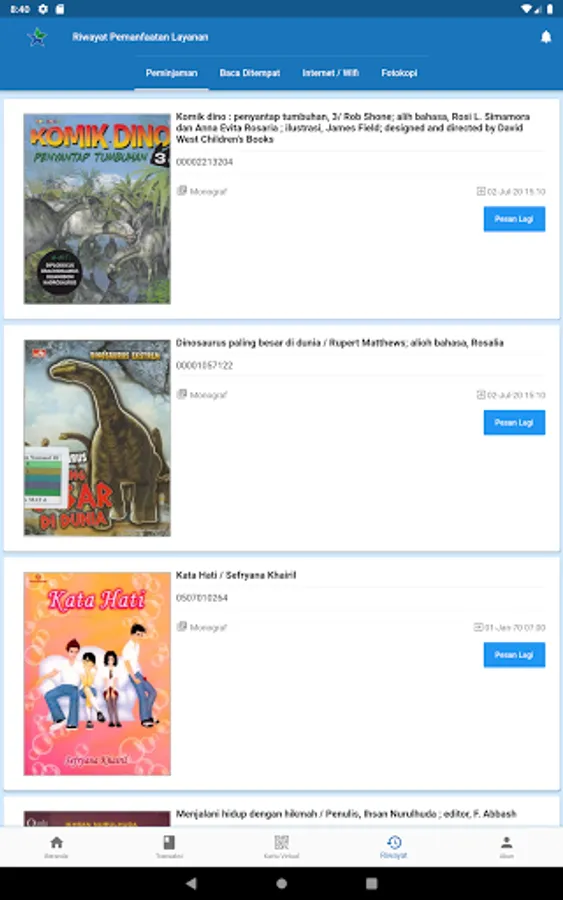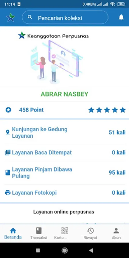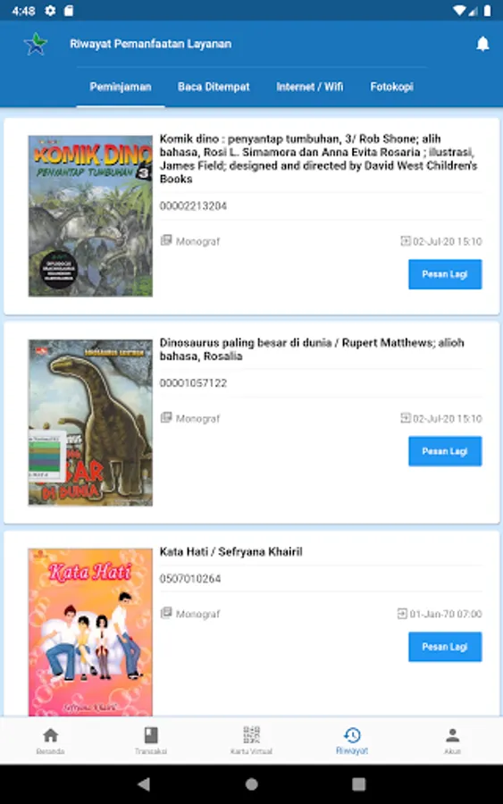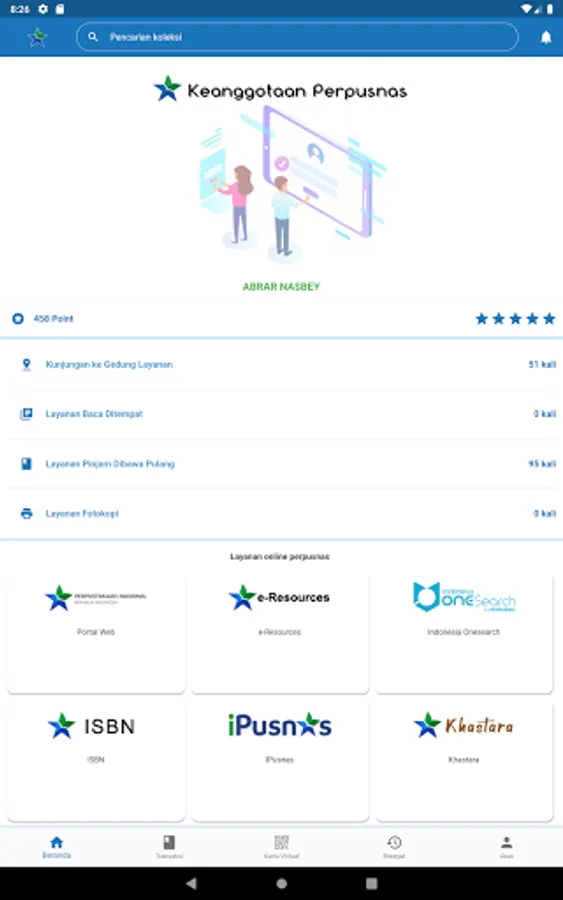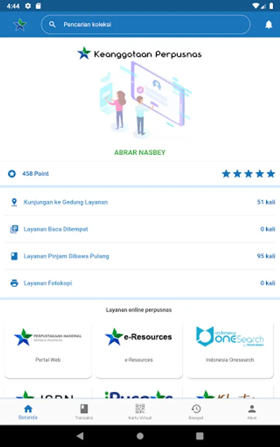 The National Library of Indonesia membership application can be used to register as a member of the National Library of Indonesia. After becoming a member, readers can search for books, view loan history, borrow books, etc. There are also links to other Indonesian National Library services such as E-Resources Services, ISBN, Ipusnas, Khastara, and the Official Website of the Indonesian National Library.